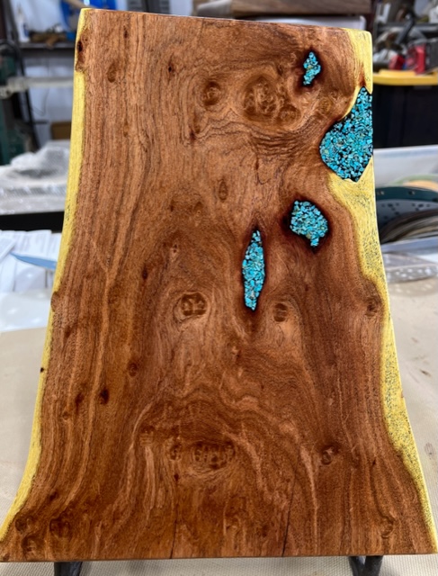I harvest and mill hardwoods, principally velvet mesquite from the Sonoran Desert, in a sustainable manner. I hand carve organic and Botanical designs or I take advantage of natural cracks and voids in the wood. I search for gem quality Kingman and Peruvian turquoise that I crush and inlay with Resin.